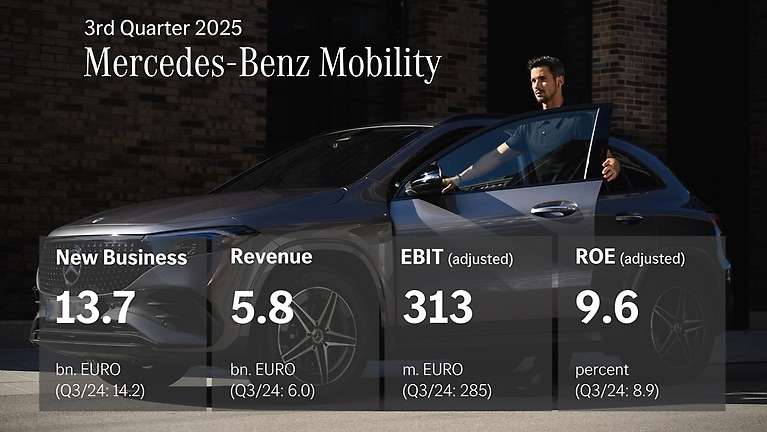 Mercedes-Benz Mobility reported a higher adjusted Return on Equity (RoE) of 9.6% in the third quarter. The adjusted EBIT increased to €313 mn in Q3 driven by ongoing efficiency measures and a positive development in the portfolio margin. This was partially offset by higher cost of credit risk amid a softer global economic environment. Contract volumes and new business reflected market developments in the automotive industry and ongoing currency effects. Third-quarter EBIT adjustments at Mercedes-Benz Mobility include an increase of provisions reflecting a recently published consultation paper by the UK Financial Conduct Authority (FCA).